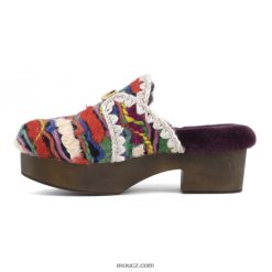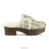 Novinka pro fw22, robustní dřevák na podpatku je odborně ručně vyrobený z řemeslně tkané textilie s charakteristickými detaily mou bavlněného háčkovaného stehu. Zaoblená otevřená špička, štíhlá silueta a platforma podpatku prodlouží a lichotí nohám. podpůrná, lehká dřevěná pata je zakončena polstrovanou semišovou stélkou pro větší pohodlí. výška 50mm.