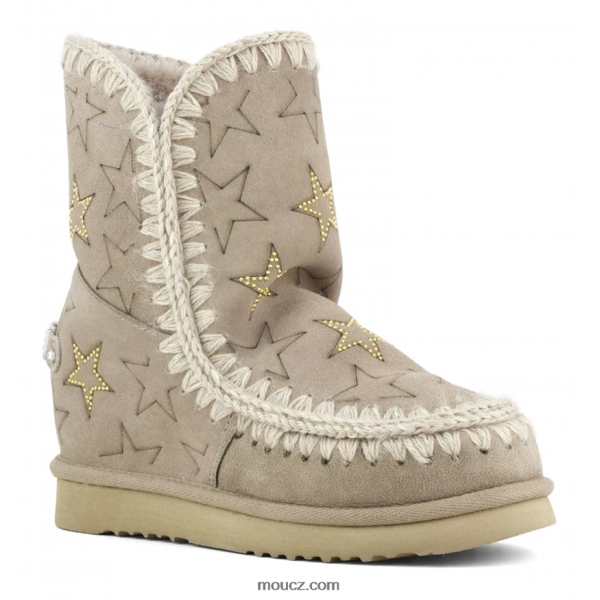 eskymácké klínové šortky s laserovými hvězdičkami a mikrocvočky v sobě spojují to nejlepší z ikony mouchy, s 5 cm skrytým podpatkem a štíhlejším tvarem. neuvěřitelně pohodlný a lichotivý, tento styl je vyroben z měkké pravé ovčí kůže, ručně háčkovaných vlněných švů, podpůrné paty a odolné eva a gumové podrážky. k dispozici ve speciálních povrchových úpravách prachu a metalické kůže. výška 23 cm. pravidelný střih.